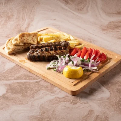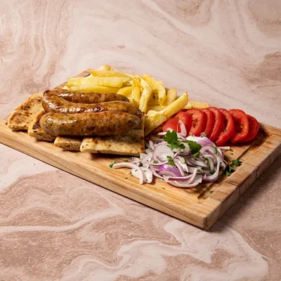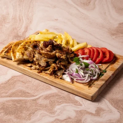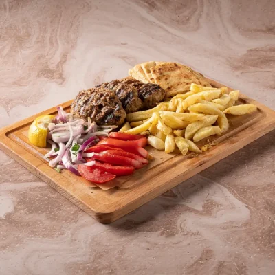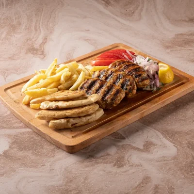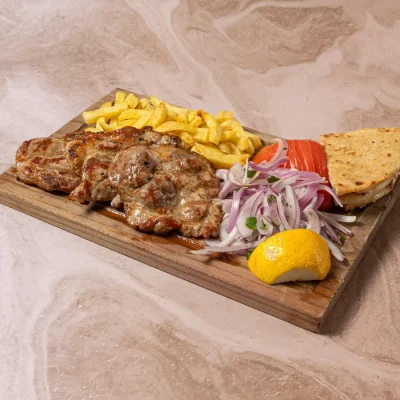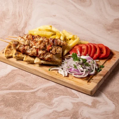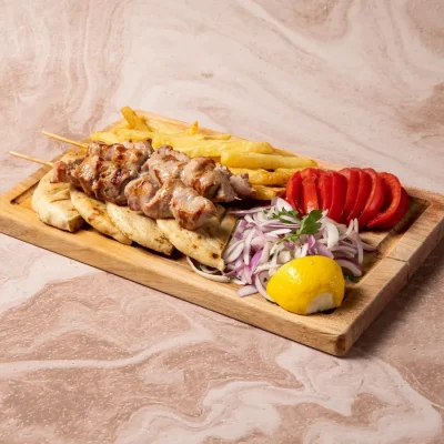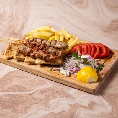 Με 1 καλαμάκι χοιρινό, 1 καλαμάκι κοτόπουλο, 1 μπιφτέκι μοσχαρίσιο, 1 μπιφτέκι γαλοπούλας, 1 κοψίδι χοιρινό, 1 κεμπάπ & 1 πανσετάκι χοιρινό. Συνοδεύεται από ντοματούλα φρέσκια, κρεμμύδι & πατάτες τηγανητές