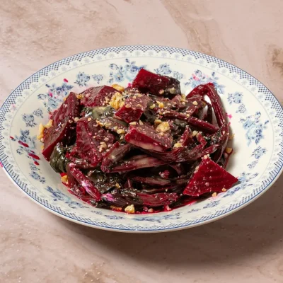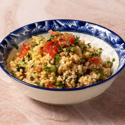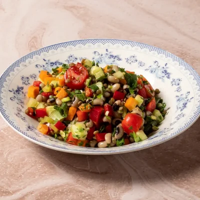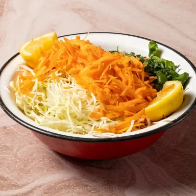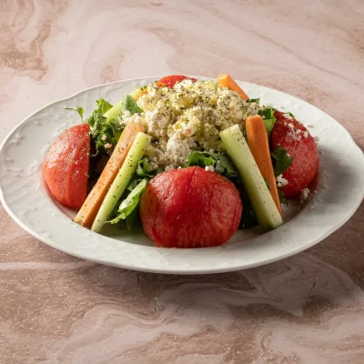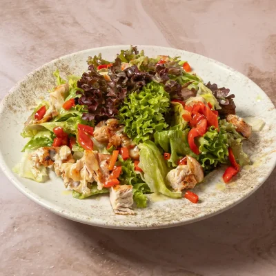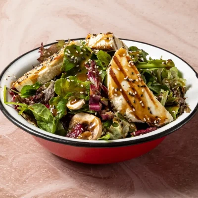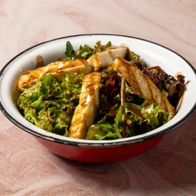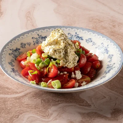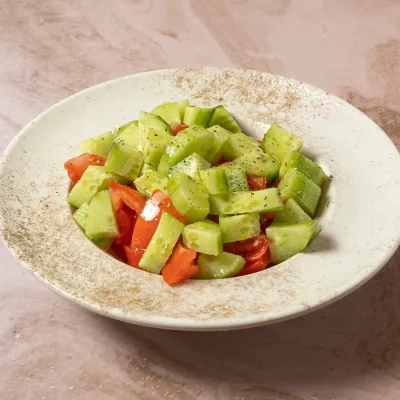 Σαλάτα με ντομάτα αποφλοιωμένη, baby ρόκα, baby σπανάκι, καρδιά μαρουλιού, φρέσκο κρεμμυδάκι, αγγούρι, καρότο, extra παρθένο ελαιόλαδο & μηλόξυδο