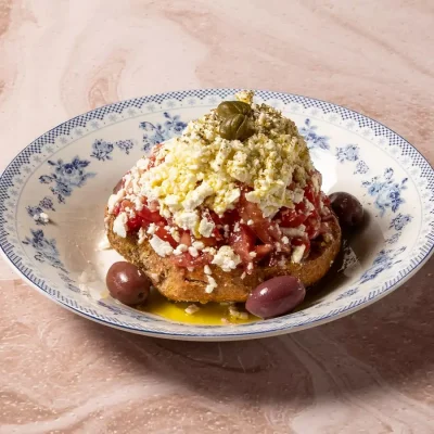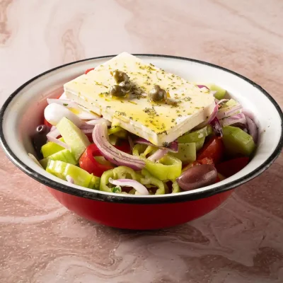 Σαλάτα με ντομάτα, αγγούρι, κρεμμύδι, πιπεριά, κάππαρη, γλιστρίδα & βαρελίσια φέτα